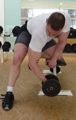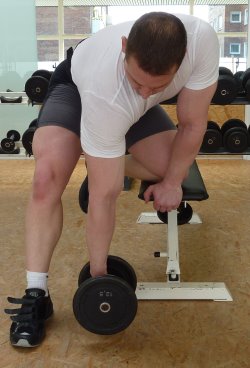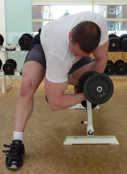 Eine weitere Übung für eine schöne Form, ist das vorgebeugte Curlen mit einer SZ-Stange, wobei die Oberarme auf die Oberschenkel aufliegen. Diese Übung sieht in der Ausführung für Außenstehende immer etwas komisch aus, doch kann man hierbei auch enorme Fortschritte erzielen und auch höheres Gewicht verwenden, als beim Konzentrationscurl. Auch wenn die letzten Wiederholungen eines Satzes nicht mehr vollständig auszuführen sind und man nur noch halbe Wiederholungen schafft, sollte man dies ausgiebig nutzen, denn dies verleiht einem einen angenehmen Pump im Bizeps nach Beendigung des jeweiligen Satzes. Meist sind noch 5-10 halbe Wiederholungen möglich und deshalb sollte man auch von vornherein ein Gewicht wählen, so dass man nicht mehr als 10 Wiederholungen schafft.