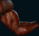 Um den Bizeps optisch größer aussehen zu lassen ist es wichtig, für eine ausreichende Höhe zu sorgen, denn ohne eine schöne kugelige Form, kommt auch ein großer Umfang nicht zur Geltung. Auch ein 50er Oberarm kann gegen einen 45er Oberarm nicht dicker aussehen, wenn der Bizeps flach wirkt, weil es ihm an Höhe fehlt. Deshalb ist es enorm wichtig, so frühzeitig wie möglich das Formen des Bizepses mit in das übliche Aufbautraining einzubinden. Leute, die wie Ronnie Coleman, mit einer nahezu göttlichen Bizepsform gesegnet sind, brauchen dieses wahrscheinlich nicht, doch für alle Normalsterblichen unter uns, sollte das ein wichtiger Bestandteil des Armtrainings sein. Es gibt durchaus einige gute Maschinen, die eine gute Höhe des Muskels bewirken, doch da es so viele unterschiedliche Geräte gibt, mit verschiedenen Winkeln und Auflagen für den Arm, ist es sehr schwer, hier explizit darauf einzugehen und somit beziehe ich mich bei den hierfür geeigneten Übungen, auf einfache Hantelübungen, die in fast jedem Studio ausführbar sind. Als erste klassische Übung hierfür, eignet sich der Konzentrationscurl. Hier gibt es zwar auch einige Variationsmöglichkeiten der Ausführung, doch das Ziel ist stets das gleiche. Ich bevorzuge eine Variante, bei der der Oberarm frei in der Luft ist und nicht am Oberschenkel anliegt, denn es ermöglicht mir eine bessere Konzentration auf meinen Muskel und ich kann mich richtig in die Übung „Hineinschrauben“. Das gedankliche Zusammenspiel und die Konzentration, zusammen mit einer sauberen Ausführung, sind gerade bei dieser Übung viel wichtiger, als das Gewicht. Es kommt im Wesentlichen auf das Gefühl an, den Muskel zu spüren. Zu spüren wie er arbeitet, wie er kontrahiert und nicht, wie viel Gewicht man schafft. Im Gegenteil, je mehr Gewicht man verwendet, desto schwieriger ist es, sich zu konzentrieren und die Übung verliert immer mehr an Effizienz. Also verwendet man am besten ein Gewicht, bei dem man wirklich gute 8 Wdh. schafft. Besser noch, man beginnt erst mal mit leichtem Gewicht und macht zur Übung 16-20 Wdh. Wenn man es schafft, dass sich der Muskel dabei verkrampft, bzw. bis ein stechender Schmerz die Spitze des Bizepsmuskels durchfährt, hat man den ultimativen Punkt erreicht. Doch sollte man lediglich kurz vor diesem Extremgefühl liegen, da man sonst jedes Mal vor Schmerz abbrechen müsste. Das sollte jeder erst mal versuchen, bevor er sich gedankenlos an diese Übung heranmacht. Es ist nicht einfach diese Konzentration während der Übung beizubehalten und selbst mir gelingt es nicht immer. Sollte man es nicht mehr schaffen nach einer bestimmten Wiederholungszahl oder nach zwei oder drei Sätzen, dann sollte man die Übung beenden. Des Weiteren bin ich der Meinung, das gerade weil es so schwer ist, dieses extreme Gefühl aufrecht zu erhalten, wenige Sätze ausreichen. Drei gute Sätze sind besser, als fünf ohne Gefühl für diese Übung.